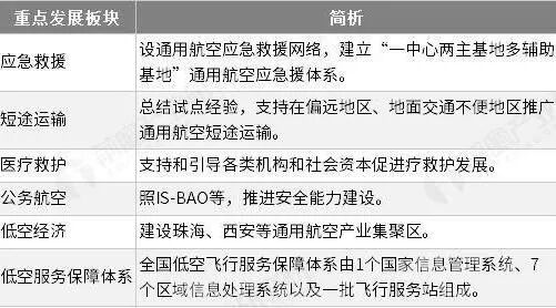 根据国务院发布的《关于促进通用航空业发展的指导意见》,发改委发布的《通用航空“十三五”发展规划》及近期发布的相关通用航空政策文件,通用航空产业短期重点发展业务板块包括:应急救援、短途运输、医疗救护、公务航空、低空经济以及低空服务保障体系建设。