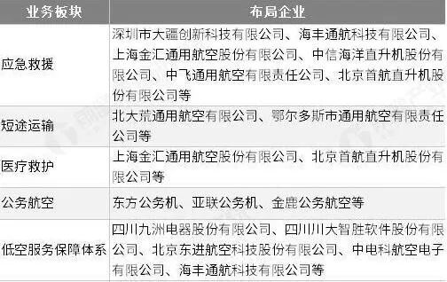 目前,布局应急救援业务板块业务的企业包括海丰通航科技有限公司、上海金汇通用航空股份有限公司、中信海洋直升机股份有限公司、北京首航直升机股份有限公司等;布局短途运输的通航企业包括北大荒(600598)通用航空有限公司、鄂尔多斯市通用航空有限责任公司等。
