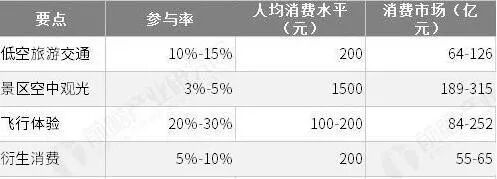 据不完全统计,2018年围绕上述景点开辟的低空旅游线路已有90余条。预计2020年全国5A级旅游景区游客数量达到8.4亿人次,其中适宜低空旅游的自然型景区游客约占50%以上,即保守估计2020年低空旅游潜在游客将达到4.2亿。低空旅游的市场需求包括旅游交通、景区空中观光、飞行体验及衍生消费四个部分。综合四类旅游消费总额,取最大值和最小值的中位数,预计到2020年,将有望形成585亿元的市场消费规模。